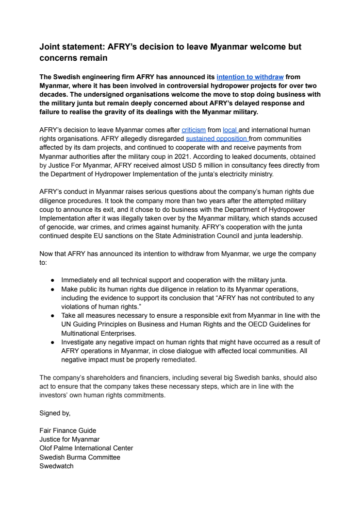 Gemensamt uttalande från Swedwatch och flera civilsamhällesorganisationer med anledning av att Afry avslutar verksamhet i Myanmar