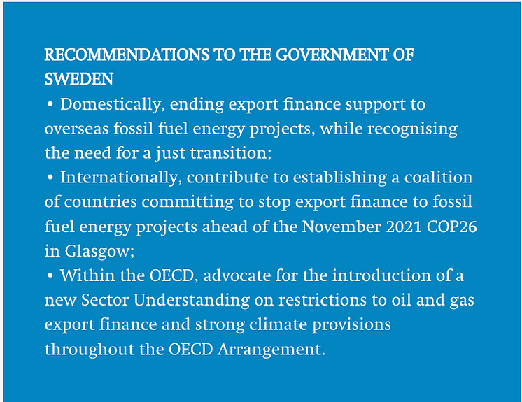 “As other countries are now moving to align the export support space to international climate goals, Sweden should take the opportunity and join these initiatives, creating momentum at an international level for a transition away from fossil fuels”, says Maneschi.